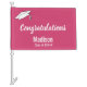 A white graduate's cap is at the top. In the center, an elegant white script forms the display text. It says 'Congratulations', but you can edit the text if desired. Under the script, there are two lines of white display text you can edit to show the graduate's name and the year the student is graduating. the car flag is baby blue.