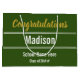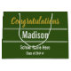 Congratulations to the graduate! In the center, there's a place for the graduate's name in white text. At the top, faux (not foil) gold script says 'Congratulations'. At the bottom, you can add the class of year and the name of the graduate's school. That text is also white. The bag is forest green.
