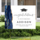 This elegant modern graduation yard sign features a navy blue watercolor agate design trimmed with faux gold glitter. The word "congratulations" appears in stylish handwriting script with flourishes at the beginning and end, topped by a silhouette of a mortar board cap. Easily customize the charcoal gray text on a white background, with the graduate's first name, school and class year in copperplate font.