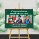 Classic 3 photo graduation party foam core display sign features "Congratulations" in stylish white calligraphy script with modern custom text that can be fully customized with the graduate's full name, class year, and school name. Add three favorite photos of the graduate to the square placeholder images. Green background color can be modified.