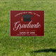 A classy custom graduation yard sign in burgundy red and gold for a high school, college, or university from the class of 2024. Customize with your school name and graduating class under the lovely calligraphy for a great personalized graduate sign.