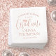 Add an elegant personalized touch to a college or high school graduation party with pink and white custom embossed foil paper napkins. All text on this template is simple to personalize. The rose gold real metallic foil design features a mortar board cap, stylish classic typography and modern script calligraphy. These unique napkins add an elegant customized touch to celebration decorations. Congratulations to the graduate!