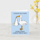 A cartoon of a large stork holding a baby in a white sheet. the image is set against a pale blue colored background and accompanied by the words 'Congratulations on becoming a great great aunt'.