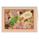 Tiny bright green reptile/lizard nestled amongst peach colored tropical succulent plants. The caption in the "bubble" is "I'm green with envy. Inside, "Congratulations!"