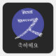 Black Korean Hangul sticker with white hangul on blue circle says Congratulations or 축하해요 and features a woodcut of the Korean "letter" Chu. Use for graduation gift, or promotion or wedding!