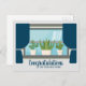 Congratulations on your new home. A beautiful happy housewarming postcard featuring a pretty windowsill filled with cute succulent plants. The window is covered with beautiful blue drapes above your congratulatory text.