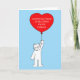 A cartoon white cat standing on it's back legs holding a large red balloon that say 'Congratulations you are foster parents'. The image has pale blue background.