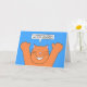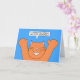 A cartoon of a cute ginger cat smiling as he throws his front paws in the air and says 'Congratulations on your new smile'. The image has a sky blue colored background.