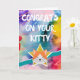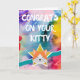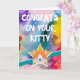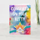 Congratulations on new cat, kitty with gold star, cat head, big bold lettering, and colorful painting background. Art, image, and verse copyright © Shoaff Ballanger Studios, 2022.