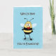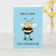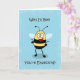Cute Congratulations on your pregnancy, expecting, greeting card features an illustrated cartoon bumble bee, hands on hips in front of blue spatter background.