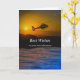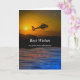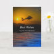 Congratulations on Retirement, paper greeting card with a dramatic scene of a helicopter flying over water with hills in the background. The sun is peeking through a hazy sky. Customize the text on the cover and inside as desired. Art, image, and verse copyright © Shoaff Ballanger Studios, 2022.