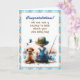 Congratulations on your new baby boy! An adorable sweet little ai watercolor illustration of a baby boy fishing with a puppy dog. The colors of this card include blue and orange.