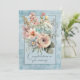 A beautiful blue and pink pastel floral bouquet and leaves on a blue heart background and framed in two shades of teal.