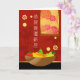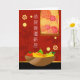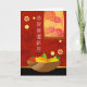 Congratulations on your new home, paper greeting card, written in Mandarin Chinese. Illustration with a bowl of fruit;, chrysanthemums wall hanging, and bamboo on the wall. Good luck items for a happy home. Art, image, and verse copyright © Shoaff Ballanger Studios, 2022.