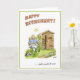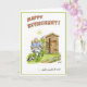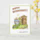 Humorous greeting card for retirement with gent sat by his allotment shed. Charming cartoon illustration.