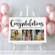 Stylish 3 photo graduation party foam core display sign features "Congratulations" in trendy black calligraphy script with silver colored grad cap and modern custom text for the graduate's name and class year. Add three favorite photos of the graduate to the square placeholder images. Clean white background color.