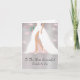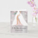 This lovely Bride-to-Be congratulations card features a bride in a white wedding gown, holding a simple bouquet of flowers, set against a silver bokeh background with delicate white and pink stars.
