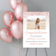 A stunning graduation welcome sign featuring cascading rose gold confetti dots above a framed senior portrait on a white background. Warm rose gold Congratulations to Our Graduate script pairs beautifully with the graduate's name, school, and class year below. An elegant and feminine display for the celebration. Fully customizable with your own photo and text.