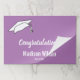 This lavender and white graduation paper placemat has a white graduate's cap in the upper left corner. White display text says 'Congratulations' in a script. You can customize the placemat with the graduate's name in white text. You can edit the year the student is graduating at the bottom.