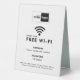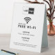 Make it easy for customers to connect with this customizable free Wi-Fi table tent sign, ideal for coffee shops, salons, waiting areas, restaurants, boutiques, Airbnb accommodation rentals, and hospitality businesses that offer complimentary internet access. Featuring a clean, minimalist black and white design, this double-sided display includes a clear Wi-Fi icon, bold “Free Wi-Fi” headline, and editable fields for your network name, password, and any additional usage instructions or terms. The top of the sign offers space to upload your own logo, allowing for seamless branding that matches your business identity. Its professional layout ensures guests can quickly find the login information they need, enhancing their overall experience while encouraging longer visits and more engagement. Printed on your choice of durable plastic or economical paper, this versatile sign is easy to place on tables, counters, or reception desks. It's a functional yet stylish solution that helps improve customer satisfaction, increases convenience, and supports brand consistency in any modern service environment.