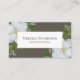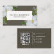 This design features a QR code connect with me business card, social media Facebook and Instagram connect, floral botanical greenery foliage, a white magnolia flower garden, a brown-gray green earth tones style, and phone email web address link contact me information info, a modern scan girly feminine elegant, a simple minimalist minimal design, a sophisticated pretty south southern