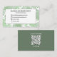 This design features a simple business card template with a modern professional simple minimalist look, minimal elegant social media icons, a trendy plain scannable QR code, a chic digital contact, a phone email cell website icon, a simple black and white, elegantly minimalist design stylish, photo or graphic template, contemporary clean modern style, with tropical botanical green palm leaves foliage
