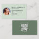 This design features a simple business card template with a modern professional simple minimalist look, minimal elegant social media icons, a trendy plain scannable QR code, a chic digital contact, a phone email cell website icon, a simple black and white, elegantly minimalist design stylish, photo or graphic template, contemporary clean modern style, with tropical botanical green palm leaves foliage