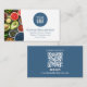 This design features a connect with us with QR code business card template with the add your own logo photo, for professional business corporate template, with social media Facebook Instagram icons, and a simple minimalist contemporary style, with online website web address URL, a modern simple typography design, a trendy stylish basic clean, great for small business owner shop store, a basic blue and white template
