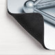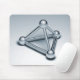 A mousepad with a 3d CGI rendered images of a three sided reflective metallic pyramidal structure made of tube connected spheres.