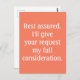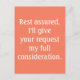 Typography Postcard with the slogan 'Rest assured, I'll give your request my full consideration'. White lettering on an amber coloured background. Send this card to anyone who asks you the appropriate question to let them know you will consider their request! Keep this card on your desk to show your boss along with my 'The Answer is No' postcard and my 'The Answer is Yes' postcard and my 'The Answer is Maybe' postcard. Easily personalise this card by editing the template text. Thanks for viewing my designs!