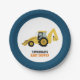 Plate features a construction theme with a navy blue border and a yellow backhoe in the middle. Customize the text with your own details, or delete to use without text. Great for a construction theme baby shower or birthday party!