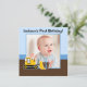 Celebrate your little boy's first birthday with this cute construction birthday photo invitation. Featuring a front loader tractor and present. Shown in blue and brown. Easily personalize with your party information and child's photo.