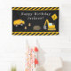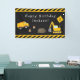 Celebrate your little one's special day with this custom boy birthday party banner with an adorable construction theme. The banner has a dump truck and excavator working together at a road construction site. There are also orange traffic cones, a yield sign, and yellow and black stripes. Add your child's age for a special touch!