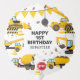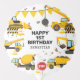 Kids construction birthday party balloon featuring a simple white background, with cute cartoon illustrations of bunting, stop signs, a dump truck, a digger, a cement truck, a wrecking ball crane, splatters of dirt, and a happy birthday template that is easy to personalize.