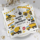 Kids construction birthday party napkins featuring a simple white background, with cute cartoon illustrations of bunting, stop signs, a dump truck, a digger, a cement truck, a wrecking ball crane, splatters of dirt, and a happy birthday template that is easy to personalize.