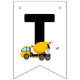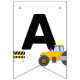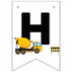 Construction themed birthday bunting flags featuring a simple white background, with cute cartoon illustrations of bunting, stop signs, a dump truck, a digger, a cement truck, a wrecking ball crane, splatters of dirt, and the saying "happy birthday".