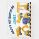 Construction trucks boys birthday party banner. Yellow and blue color digger, crane, dump truck, cement mixer and loader trucks.