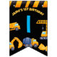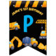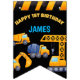 Construction trucks boys birthday happy birthday bunting flags party banner. Yellow and blue color digger, crane, dump truck, cement mixer and loader trucks.
