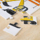 This design features four classic construction trucks in bold yellow arranged together on a brown and black background. It includes other construction items like guard rails and traffic cones and black and yellow traffic stripes. We have you covered for a construction trucks themed party: supplies, decor, delicious treats and meaningful personalized gifts!