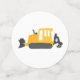 Cute construction vehicles with caution signs and construction cones on a white background birthday party pattern.