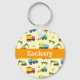 A cute and colourful construction vehicles theme pattern keychain for the boys. The pattern is make up of lots of construction elements like a red and yellow dump truck carrying the debris, an orange excavator, a green front loader pushing dirt, a blue and yellow concrete mixer, orange and white cones and a yellow and black construction zone barrier. Personalise child's name within space available. Perfect for boys who love construction vehicles, toys and machines!
