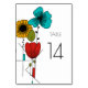 This customizable wedding table number card has a clean and modern look. It features a floral illustration inspired by Art Nouveau design in black, bright turquoise blue, red, light green and golden yellow. You will need to customize each card with your table's number. The design and text appear on both sides of this card.
