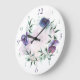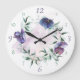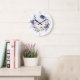 Functional art for your wall that tells time in a flowing contemporary art wreath of graceful foliage and deep blue and purple hydrangea florets. The wreath is a clear image over a watercolor smudge print background so you can customize as desired.