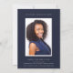 Contemporary geometric typography and color block, graduation announcement and invitation card. Modern geometric "Graduate" on navy blue backgrounds. Template lines for graduate's name, graduation year, school name and graduation party details on back. Single framed photo on front and an additional photo space on back.