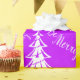 A modern, yet elegant Christmas wrap featuring a purple and white theme of white Christmas trees and 'Be Merry' Christmas greetings, scattered over a purple background to give your gift wrapping a contemporary, stylish look this holiday season.