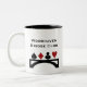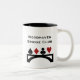 Bridge player's coffee mug done in white, with graphics of a black bridge symbol and the red and black card suits, on top. Personalize the black text to read what you want. Great for bridge clubs and tournaments.