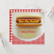 An invitation featuring a photo of a plain hot dog in a bun on a white paper plate. Yellow text over hotdog mimics mustard and reads "You Are Invited." Personalize the yellow and red text below the hotdog with your name and details of your event. Red and white gingham background at bottom. Opposite side features solid red and white gingham background.