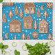 Hand drawn vector pattern featuring various gingerbread houses, fir trees, snowflakes and crescent moon-shaped cookies on blue with falling snow