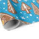 Hand drawn vector pattern featuring various gingerbread houses, fir trees, snowflakes and crescent moon-shaped cookies on blue with falling snow