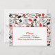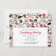 A cooking party invitation with a retro inspired red and black pattern of cooking supplies. Pattern features illustrations of a mixer, stove, whisk, spatula, rolling pin, oven mitt, and cherries. Personalize the text on front and back.